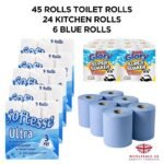This Home Care Supplies set includes 45 Toilet Rolls and 24 Kitchen Rolls, as well as 6 Blue Rolls for your convenience. The toilet rolls are made with 3 plies, providing strength and durability while remaining soft and gentle on your skin. With a luxury quilted design, these rolls offer a touch of elegance to any bathroom. In addition to being soft on skin, these toilet rolls are also eco-friendly and sustainable. They’re flushable for easy disposal without harming the environment. The family sheets wipes provide further convenience with their degradable and recyclable material. This Home Supplies set is perfect for the bathroom or toilet in any home! With over 150 sheets per roll, you’ll have enough to go around without constantly restocking. Plus you can take comfort in knowing that you’re making an environmentally conscious choice with this eco-friendly option.