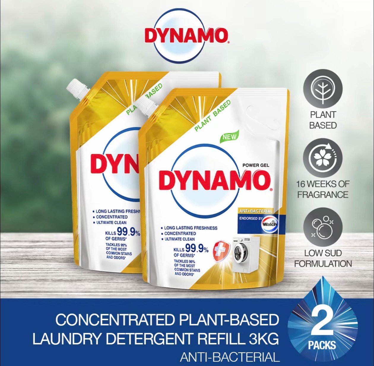 DYNAMO plant-based concentrated liquid detergent kills 99.9% bacteria and removes 99% of common stains for a fresher-smelling laundry, ensuring up to 72 hours of long-lasting anti-bacterial effect.