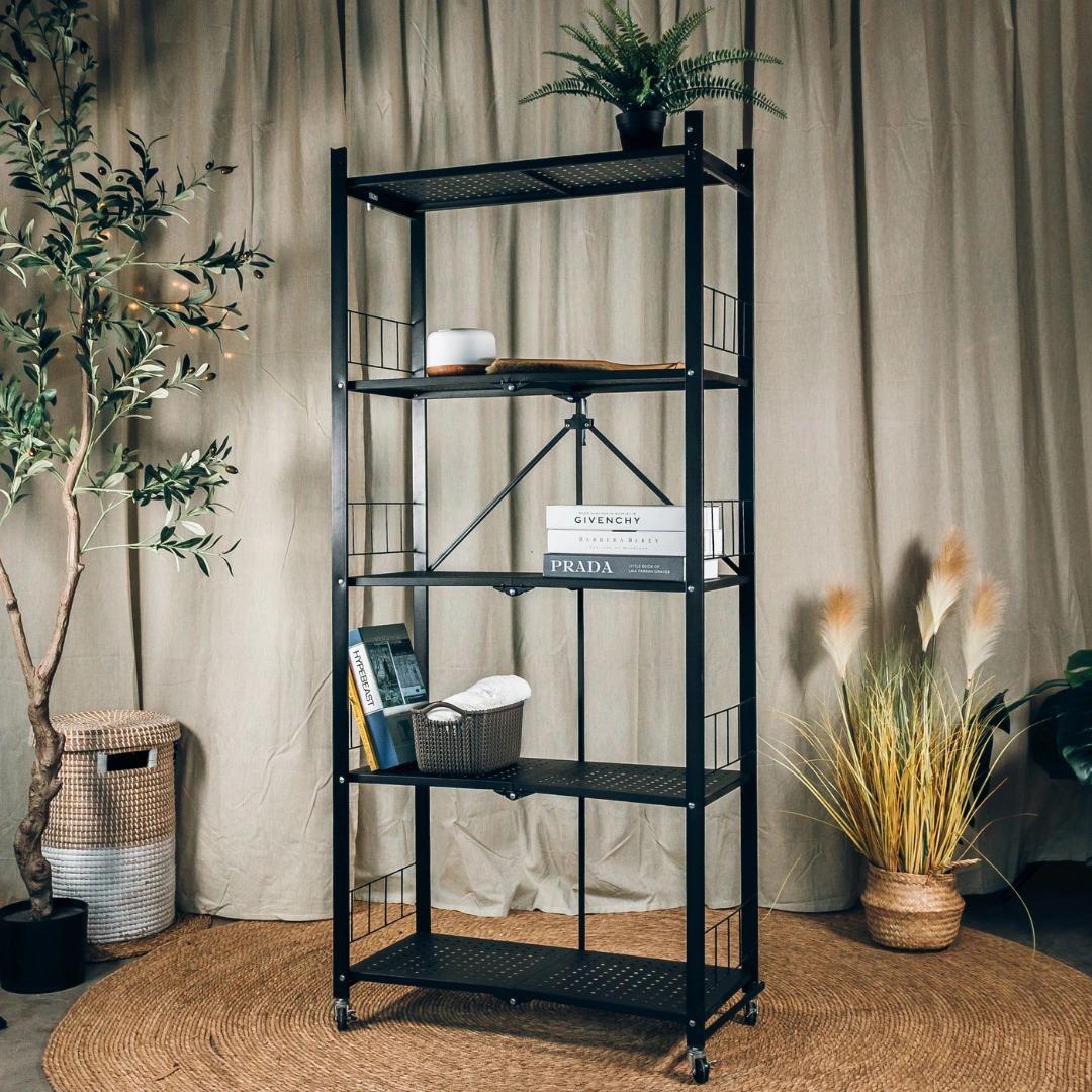 As living dynamics constantly shift. the HOUZE – SLIM – 3/4/5 Tier Foldable Storage Shelf is a sophisticated answer to age-old clutter conundrums. Meticulously crafted from robust carbon steel. these shelves promise longevity while tailoring perfectly to your requirements. With dimensions of a mere (72L x 34W)cm. this range boasts solidity. with the skill to fold and tuck away discreetly. A handy lock ensures it remains steadfast. whilst the 360° rotating wheels make relocating it child’s play.