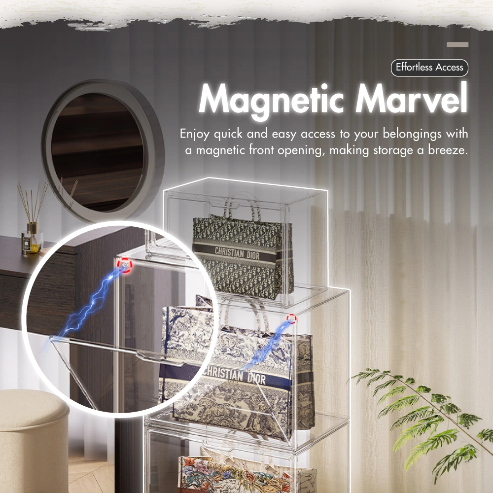 The MollyBag Stackable Acrylic Bag Storage Collection is a stylish and practical solution for organizing and displaying your handbags. purses. and other accessories. Made from clear. durable acrylic. these storage boxes provide an elegant way to showcase your collection while keeping it easily accessible and protected. Designed with a sleek. stackable feature. the MollyBag collection is ideal for maximizing space in closets. bedrooms. or dressing rooms.