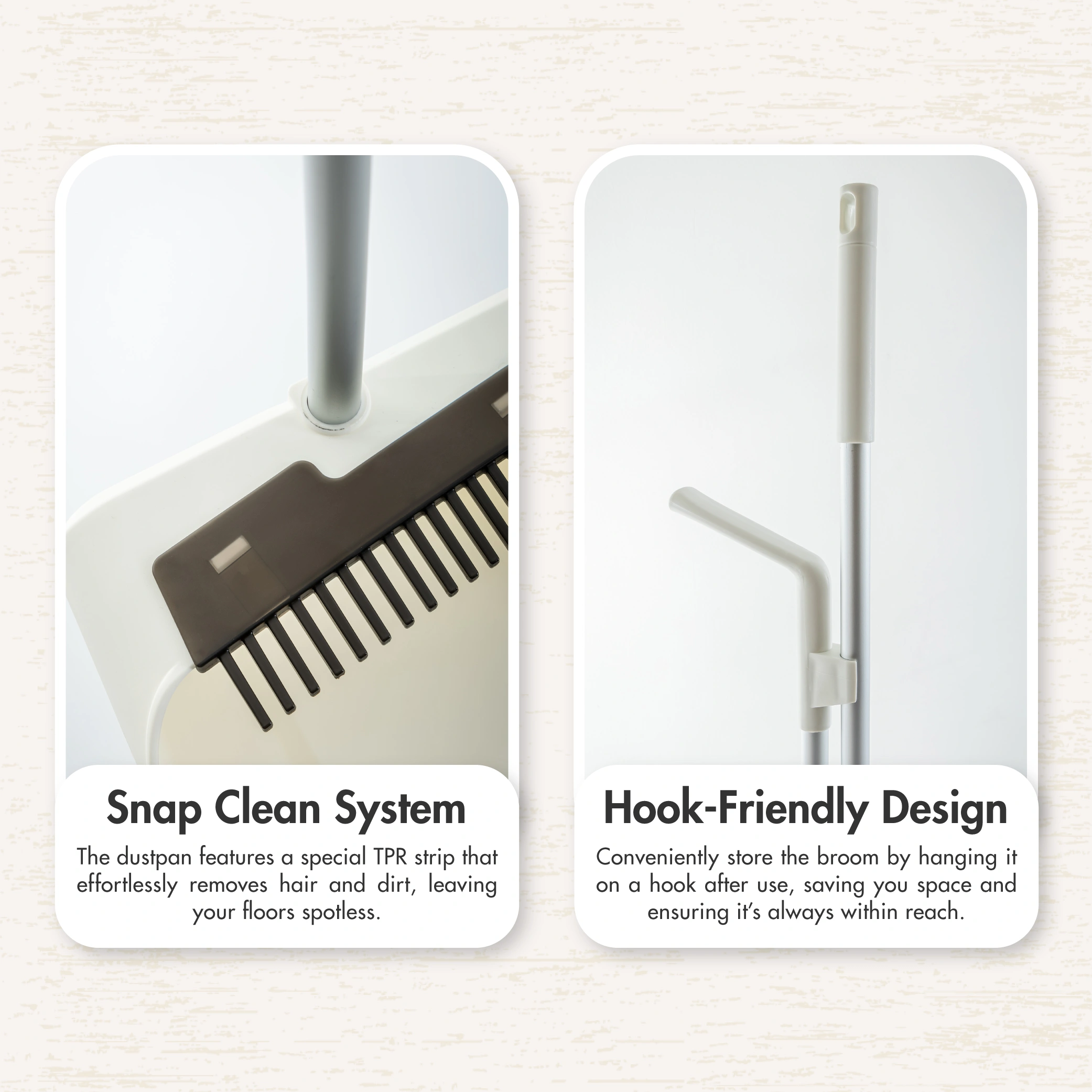 - Clip-On Dustpan: The matching dustpan clips onto the broom handle for compact storage and features a rubber edge to ensure debris is easily swept into the pan.