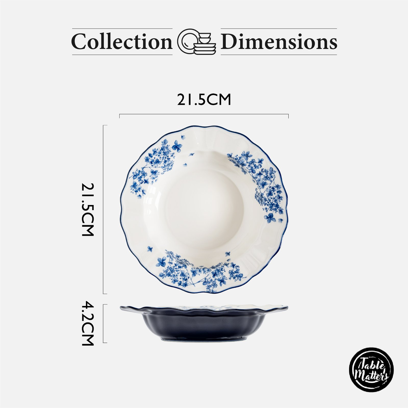 – 8.5 inch Pasta Plate: (21.5L x 21.5W x 4.2H)cm